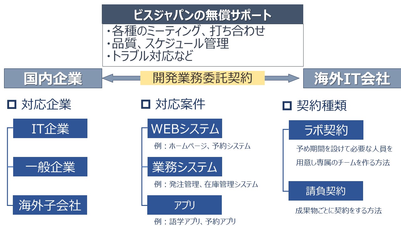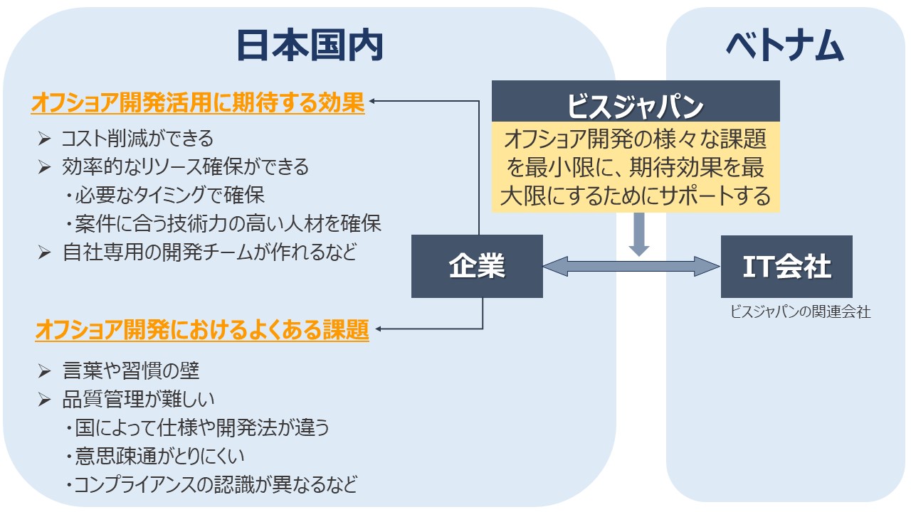 弊社はベトナムにある経験及び実績が豊富なIT関連会社を持ち、オフショア開発を成功させるために業務委託先とのやりとり、進捗管理、品質管理等様々な安心サポート致します。