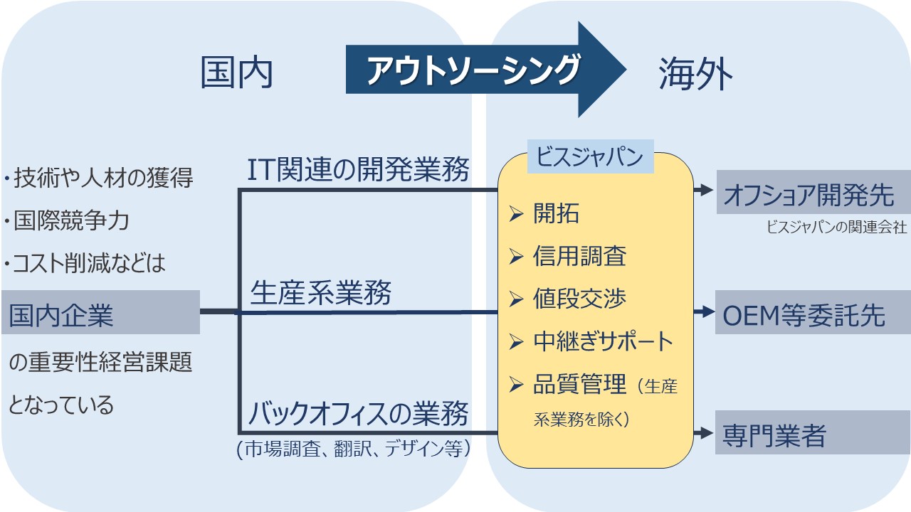 日本では長年にわたって低い出生率と高い平均寿命が、続いており少子高齢化が進んでおり、日本国内では労働力人口の不足が深刻かつ重大な問題となっています。日本企業が国内競争はもちろん、グローバル化する競争環境で生き残るためには、技術や人材の確保が不可欠です。したがって、近年、日本企業は積極的に業務を若い労働力年齢層の人口が多い国へ、また先進技術の普及が高い国など海外へ国内業務を委託することが求められています。